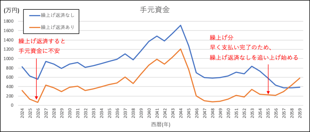 そこで、手元資金の観点で繰上げ返済の良し悪しを判断するため、手元資金額を年数を横軸にして2パターングラフ化してみました。
