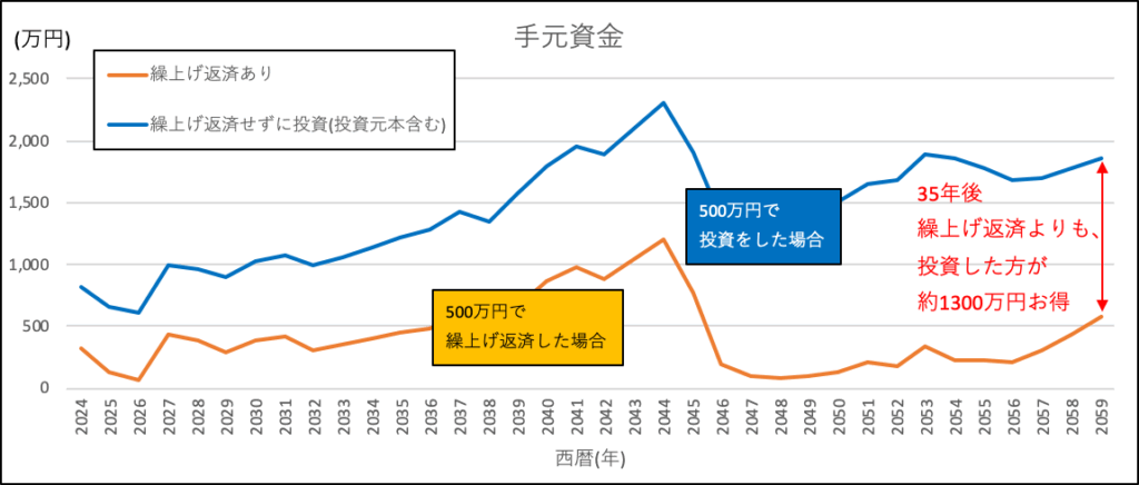 投資した場合と繰上げ返済した場合で比較したグラフがこちらになります。