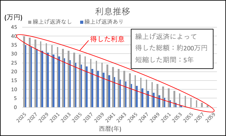 具体的なイメージのために500万円を繰上げ返済をした場合の利息の変化をグラフ化しました。(元利金等・金利変動なしの場合)