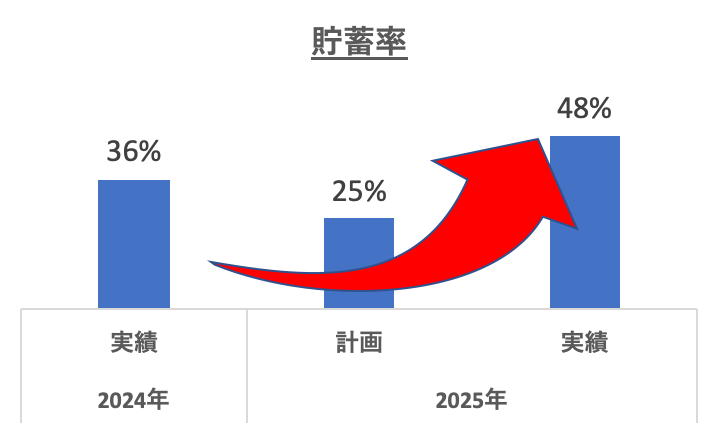 2025年の期初、私が立てていた計画では、手元に残るキャッシュフローは「25%」を想定していました。結果として、昨年の貯蓄率36%をさらに更新し、計画に対して倍近い「48%」を残せたことになります。
